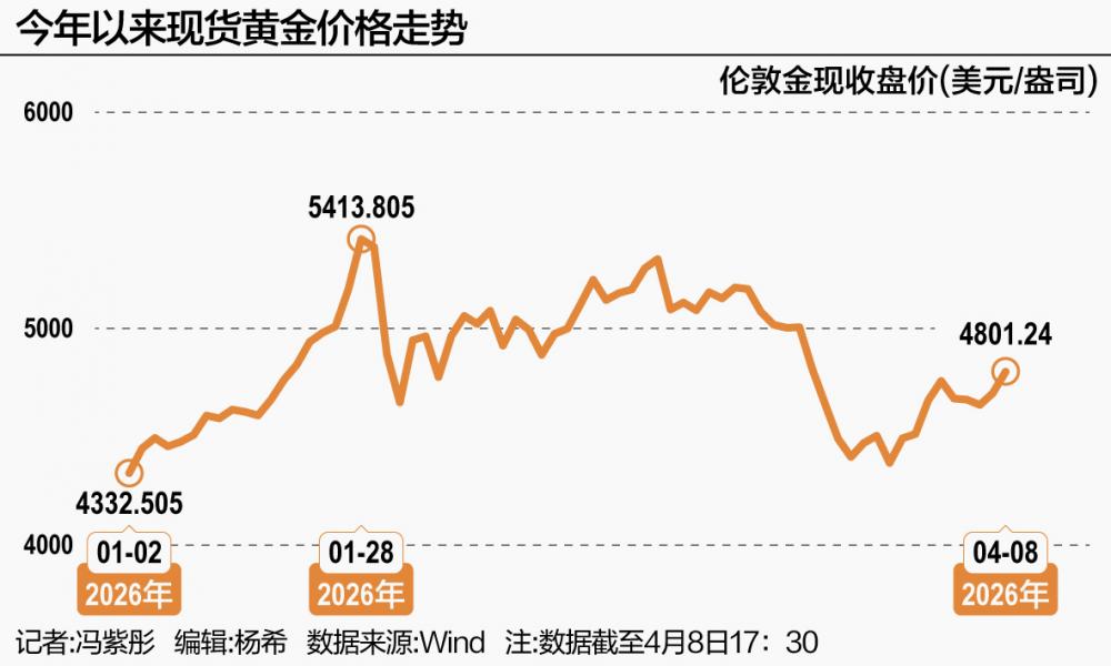 截至4月8日下午3时,Wind数据显示,伦敦现货黄金报每盎司4809.8美元,日内上涨2.31%;纽约期金(COMEX黄金)报4861.0美元/盎司,大涨3.76%,盘中最高上探至4888美元/盎司;上海黄金交易所AU9999报价1058.5元/克,日内涨30元、涨幅近3%。